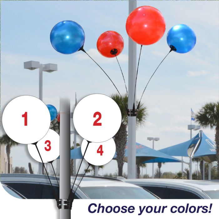 Create an eye-catching look by lining your parking lot with four-balloon light poles! Choose any four solid color vinyl balloons and be seen from any angle. These balloons tower over the ground to make your lot stand out! Plus, a great option if theft is common in your area (the height makes them harder to reach).